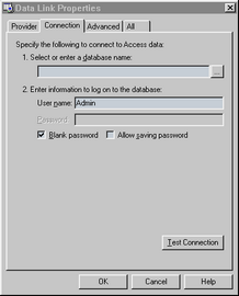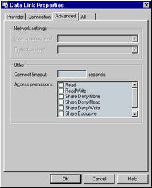 При выборе «Use data link file» и нажатии на кнопку «Browse...» появляется стандартный диалог выбора файла. Этот файл можно создать в любом окне explorer-а (в этом окне открытия файла, в самом explorer, на desktop и т.д.) вызвав контекстное меню и выбрав пункт «New/Microsoft Data Link». Потом вызовите локальное меню для созданного файла и выберите в нем пункт «Open». После этого появится property sheet описанный чуть ниже. Эти же вкладки содержит и property sheet, вызываемый через пункт «Property» локального меню UDL файла, но в нем еще есть вкладки относящиеся к самому файлу.