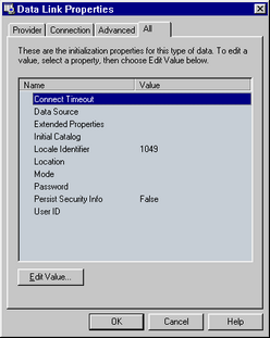На странице «All» можно отредактировать все параметры с предыдущих страниц и параметры зависящие от провайдера, но не вошедшие на страницу «Connection». Редактирование осуществляется в виде параметр - значение, причем в текстовой форме, никаких диалогов нет. Помощи то же нет, эти параметры описаны только в документации на провайдер. Ее можно найти в MSDN Data Access Services/Microsoft Data Access Components (MDAC) SDK/Microsoft ActiveX Data Objects (ADO)/Microsoft ADO Programmer's Reference/Using Providers with ADO.