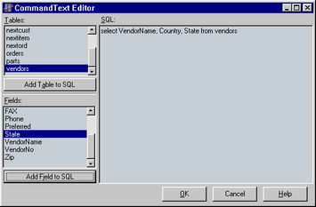 Рис. 10- Кнопка «Add Table to SQL» добавляет в текст SQL запроса таблицу, выбранную в списке «Tables», а «Add Field to SQL» поле таблицы, выбранное в списке «Fields».