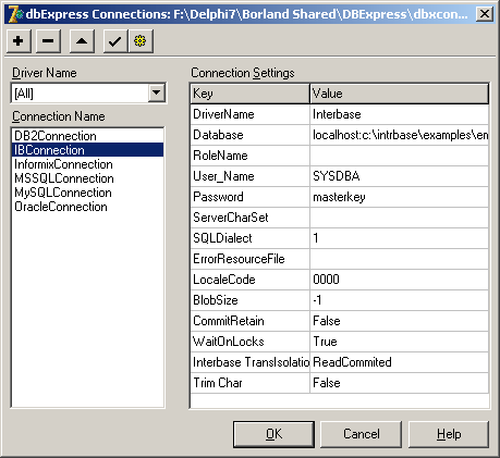 Для создания нового соединения сделайте двойной клик мышью на компоненте SQLConnection, при этом откроется окно Connection Editor. С левой стороны показываются созданные ранее алиасы. Список выбора Driver Name позволяет отфильтровывать нужные алиасы по типам серверов. Сетка Connection Settings показывает список параметров для текущего соединения (они могут отличаться в зависимости от типа драйвера). Все алиасы, которые вы создаете, хранятся в файле dbxconnections.ini.