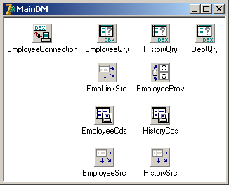 - Назовите первый компонент EmployeeQry, второй HistoryQry, и третий - DeptQry