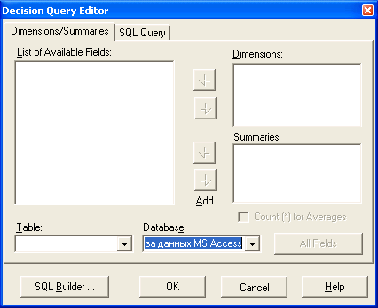 Из списка доступных полей при помощи кнопок Add требуемые поля можно перенести в список полей - размерностей Dimensions и список суммирующих полей Summaries. Поля из этих списков используются при создании запроса.