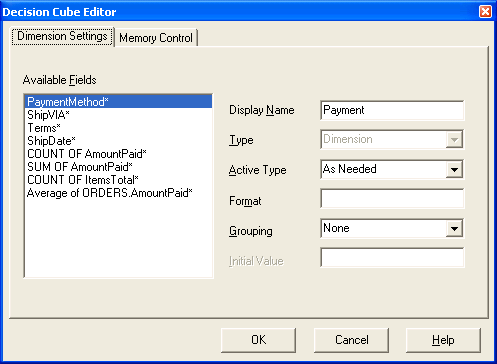 Для настроек размерностей используется страница Dimension Settings этого редактора. В расположенном слева списке Available Fields содержатся все поля набора данных. В элементах управления справа приведены параметры размерности для выбранного поля.