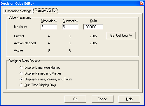 Страница Memory Control используется для управления расходом памяти для нужд компонента. Однострочные редакторы Dimensions, Summaries и Cells в ряду Maximum позволяют задать максимальное число размерностей, сумм и ячеек, соответственно.