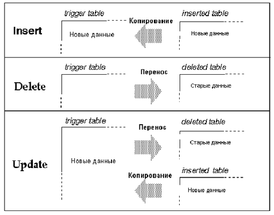 При вызове триггеров используются две специальные таблицы: таблица удаления (deleted table) и таблица добавления (inserted table). Они используются для проверки операторов модификации данных и создания условий для работы триггеров. Пользователь не может непосредственно изменять данные в этих таблицах, но может использовать находящуюся в них информацию для проверки последствий выполнения операторов insert, update или delete.
