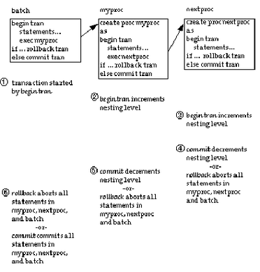 Первая явная или неявная (в связанном режиме) команда begin transaction начинает транзакцию в пакете, сохраненной процедуре или триггере. Каждая последующая команда begin transaction увеличивает уровень вложенности на единицу. Каждая последующая команда commit transaction уменьшает уровень вложенности, пока не будет достигнут 0. После этого SQL Сервер заканчивает всю транзакцию. Команда rollback transaction отменяет всю транзакцию вплоть до первой команды begin transaction независимо от уровня вложенности и числа промежуточных процедур и триггеров.