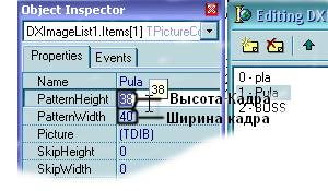 Идём в DXImageList, находим наш спрайт Pula и загружаем картинку с анимацией. Далее устанавливаем свойства спрайта следующим образом: