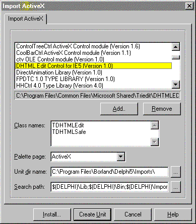 В появившемся окне, в списке зарегестрированных ActiveX Control'ов находим строку "DHTML Edit Control..." и выделяем ее (я не обещаю что у всех она будет, но если вдруг не будет попробуйте нажать кнопку "Add" и найти файл "C:\Program Files\Common Files\Microsoft Shared\Triedit\DHTMLED.OCX")..