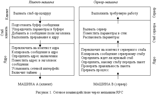 Программы, общающиеся через сеть, нуждаются в механизме связи. На нижнем уровне по поступлении пакетов подается сигнал, обрабатываемый сетевой программой обработки сигналов. На верхнем уровне работает механизм rendezvous (рандеву), принятый в языке Ада. В NFS используется механизм вызова удаленных процедур (RPC), в котором клиент взаимодействует с сервером (см. Рисунок 1). В соответствии с этим процессом клиент сначала обращается к процедуре, посылающей запрос на сервер. По прибытии пакета с запросом сервер вызывает процедуру его вскрытия, выполняет запрашиваемую услугу, посылает ответ, и управление возвращается клиенту.