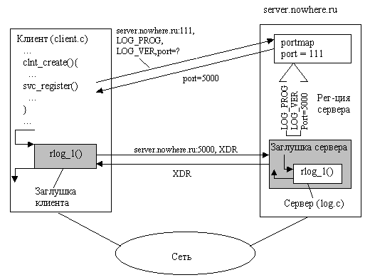 rlog_1(), определенную в заглушке клиента, и передает управление заглушке. Та, в свою очередь, формирует запрос (преобразуя аргументы в формат XDR) в виде пакета UDP и направляет его на удаленный порт, полученный от сервера portmap(IM). Затем она некоторое время ожидает отклика и в случае неполучения повторно отправляет запрос. При благоприятных обстоятельствах запрос принимается сервером logger (модулем заглушки сервера). Заглушка определяет, какая именно функция была вызвана (по номеру процедуры), и вызывает функциюrlog_1()модуля log.c. После возврата управления обратно в заглушку последняя преобразует возвращенное функциейrlog_1()значение в формат XDR, и формирует отклик также в виде пакета UDP. После получения отклика заглушка клиента извлекает возвращенное значение, преобразует его и возвращает в головную программу клиента.