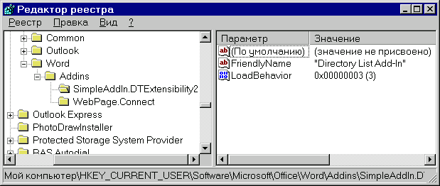 При помощи редактора реестра создайте в реестре Windows запись для регистрации Add-In с приложением Microsoft Office. COM Add-In готов!